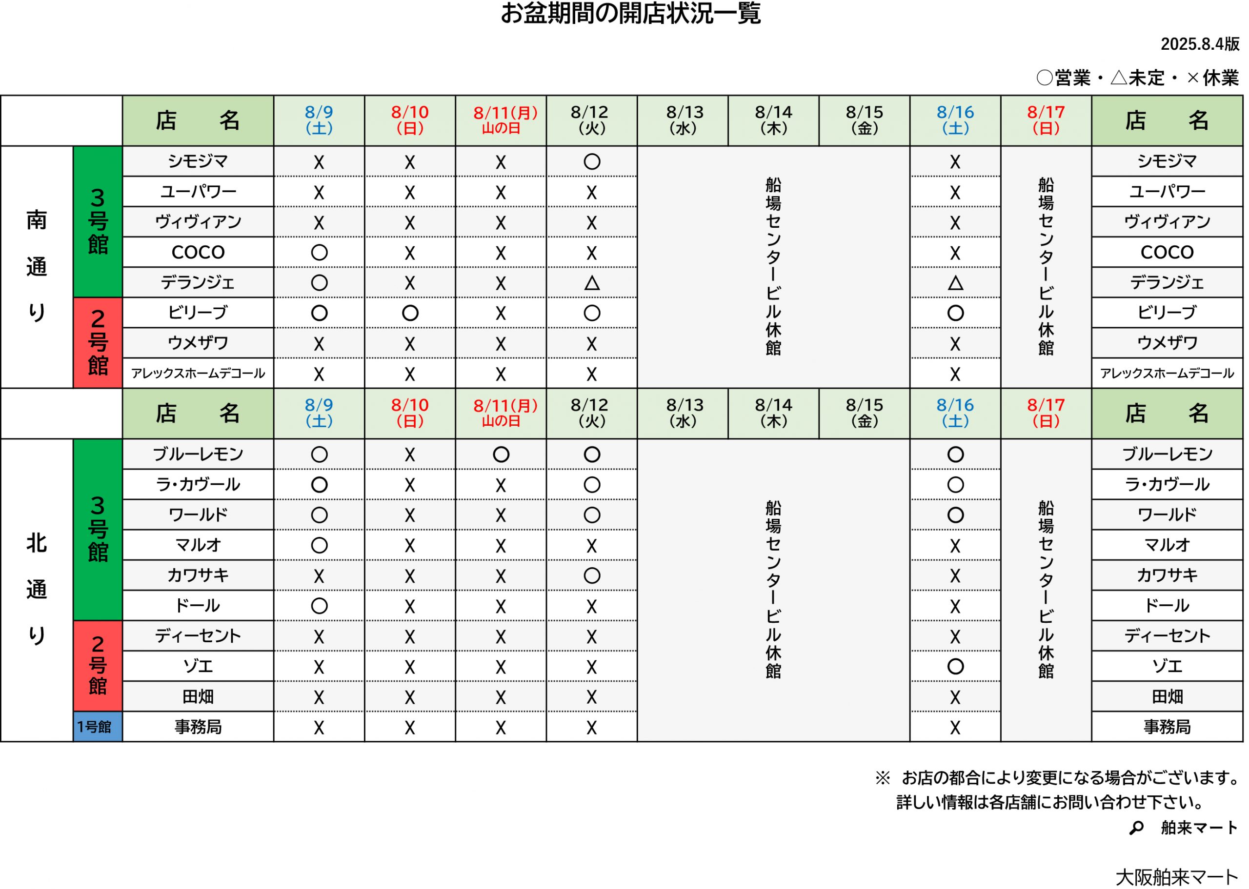 お盆期間中の各店舗の開店状況は上記表のとおりとなっております。